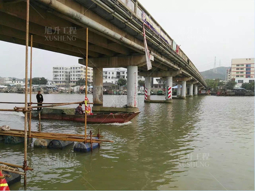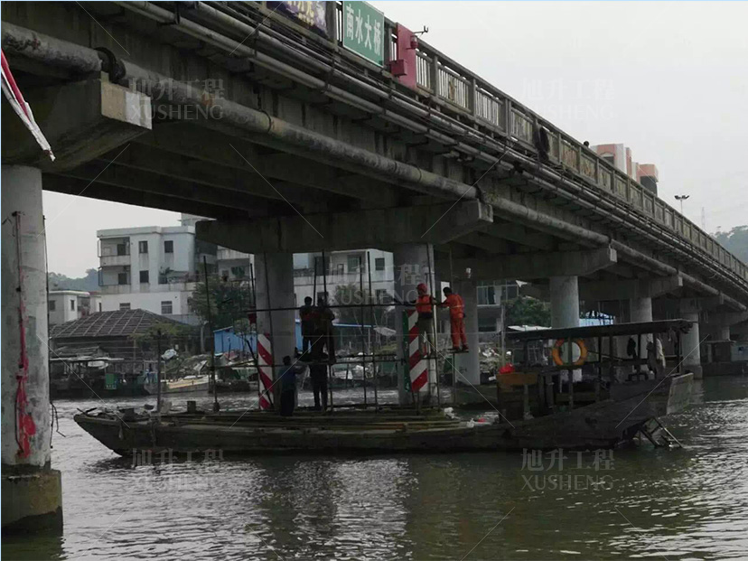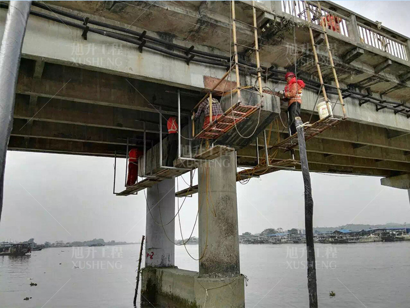 我公司對(duì)其進(jìn)行加固維修改造,包含T梁修補(bǔ)、水下樁基礎(chǔ)加固、補(bǔ)裂縫、PLC電腦同步頂升橡膠支座更換、伸縮縫更換。