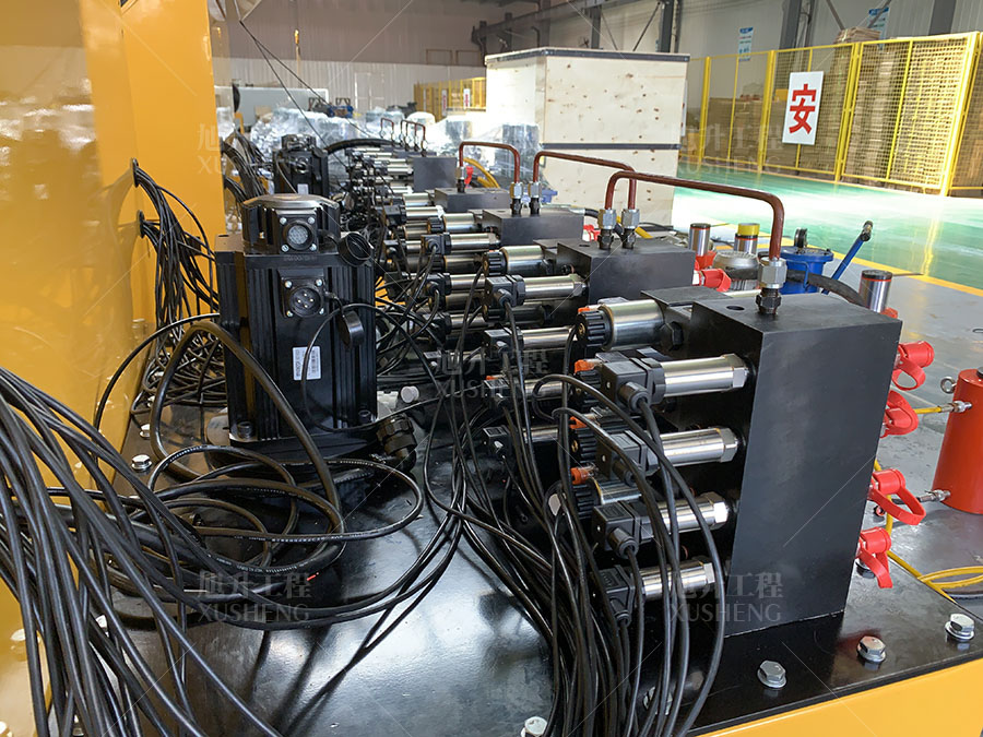 2、安裝液壓軟管,根據(jù)千斤頂?shù)姆植迹謩e將各個千斤頂串聯(lián)一起再和液壓頂升泵站的油路出口用液壓軟管連接上。