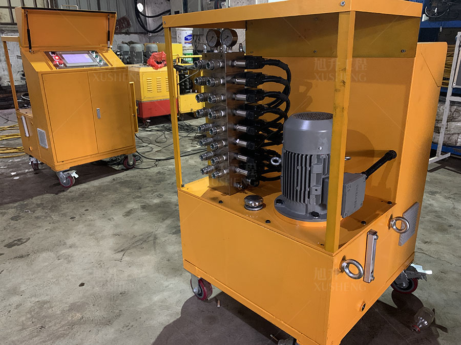 2、安裝液壓軟管,根據千斤頂的分布,分別將各個千斤頂串聯(lián)一起再和液壓頂升泵站的油路出口用液壓軟管連接上。