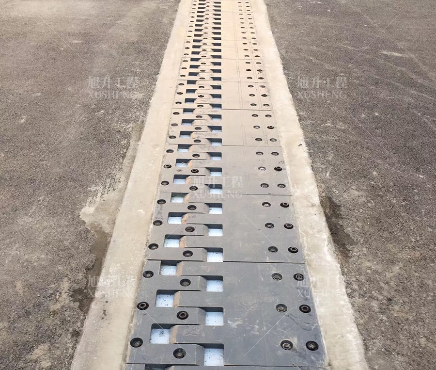 SF鋼齒型伸縮縫面層板為梳齒形防滑槽鋼板,從左右伸出橋面板間隙處相互嚙合的支承式構(gòu)造,伸縮縫結(jié)構(gòu)剛度較大,可承受較大的水平變位,伸縮量可達(dá)420mm。