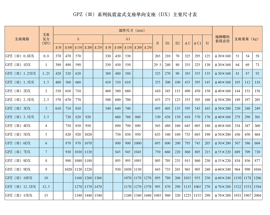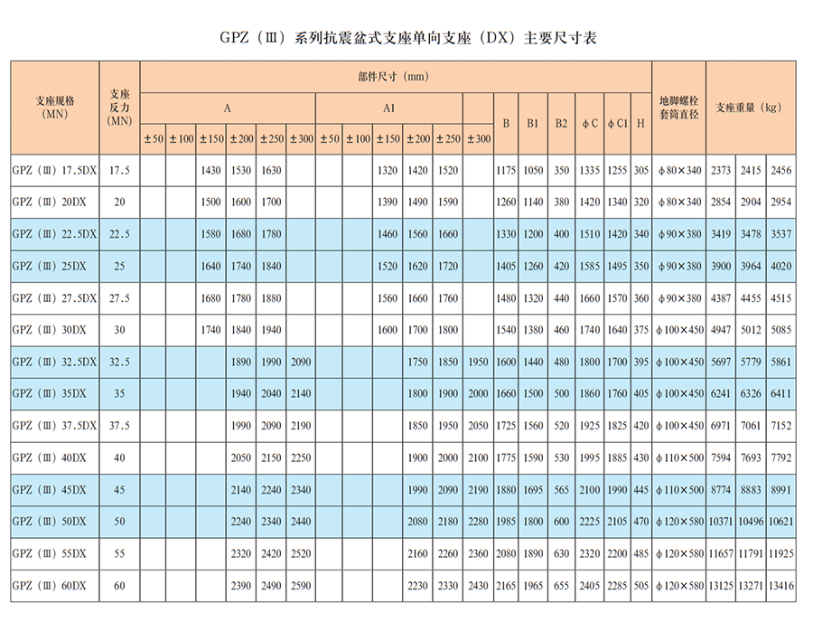 GPZ( Ⅲ ) 系列橋梁抗震盆式支座按其使用時的位移能力分為二類,即單向活動支座具有豎向轉(zhuǎn)角功能和單一方向位移功能,代號 DX;