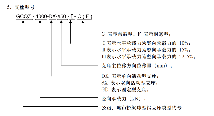 本例表示豎向承載力為 4000kN,主位移方向位移量為 ±50mm,水平承載力為豎向承載力的10%,常溫單向活動型球型鋼支座。該系列支座根據(jù)使用環(huán)境分普通型(一般大氣環(huán)境)和耐腐蝕型(海洋大氣環(huán)境與重度污染大氣環(huán)境),耐腐蝕支座型號后加注(NS)以做標(biāo)識;如上述示例耐腐蝕型支座表示為:GCQZ-4000-DX-e50- Ⅰ -NS。